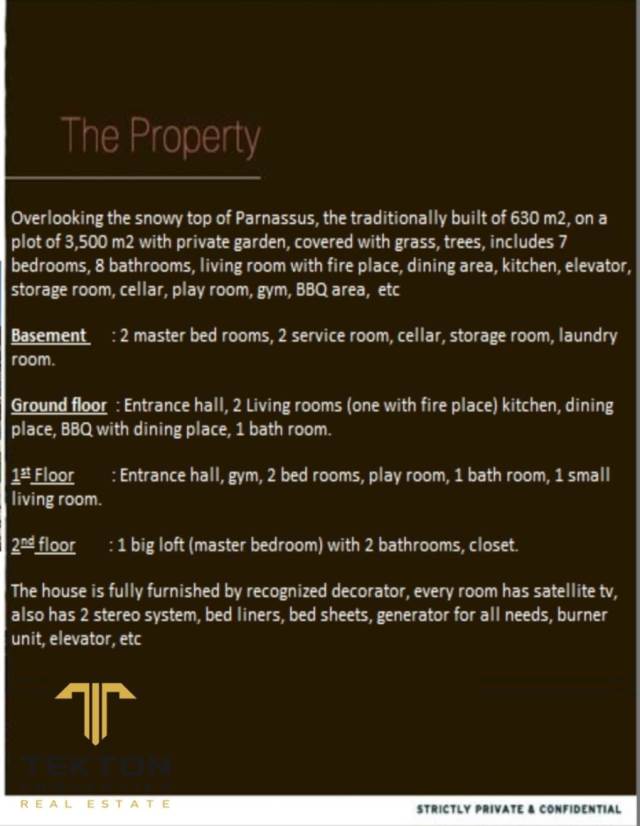 Arachova, Villa For Sale, 630 sq.m., In Plot 3500 sq.m., Floor: Ground floor, 2 Level(s), 7 Bedrooms 1 Kitchen(s), 8 Bathroom(s), Energy Certificate: A+, Type of door frames: Aluminum, Features: Elevator, Storage room, Fireplace, Playroom, BBQ, Luxury, Mansion, Airy, Roadside, Bright, AirConditioning, Grass, Trees, Back yard (Garden), Suitable for Commercial Use, Price: 2.000.000€. Tekton Properties Real Estate, Tel: 6944831817, email: tekton@tektonproperties.gr